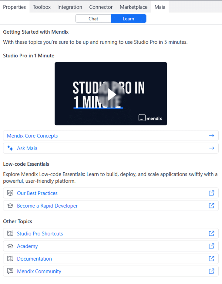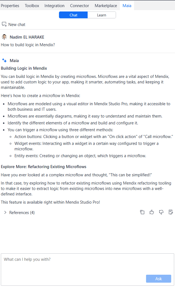 MAIA intègre un volet interactif directement dans Mendix Studio Pro. Il permet de poser des questions contextuelles, de rechercher dans la documentation et d’obtenir des suggestions adaptées. L’onglet « MAIA Learn » guide les débutants dans l’exploration des fonctionnalités de la plateforme.