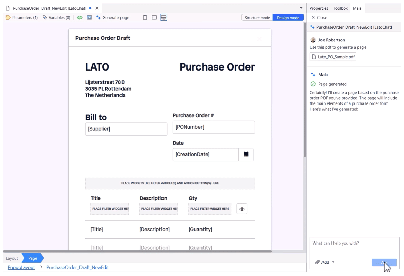 MAIA intègre également une fonctionnalité de génération automatique de pages à partir de prompts textuels ou d’images. Basée sur l’intelligence artificielle générative, cette capacité vise à convertir une intention de design en interface directement exploitable dans Mendix 11.