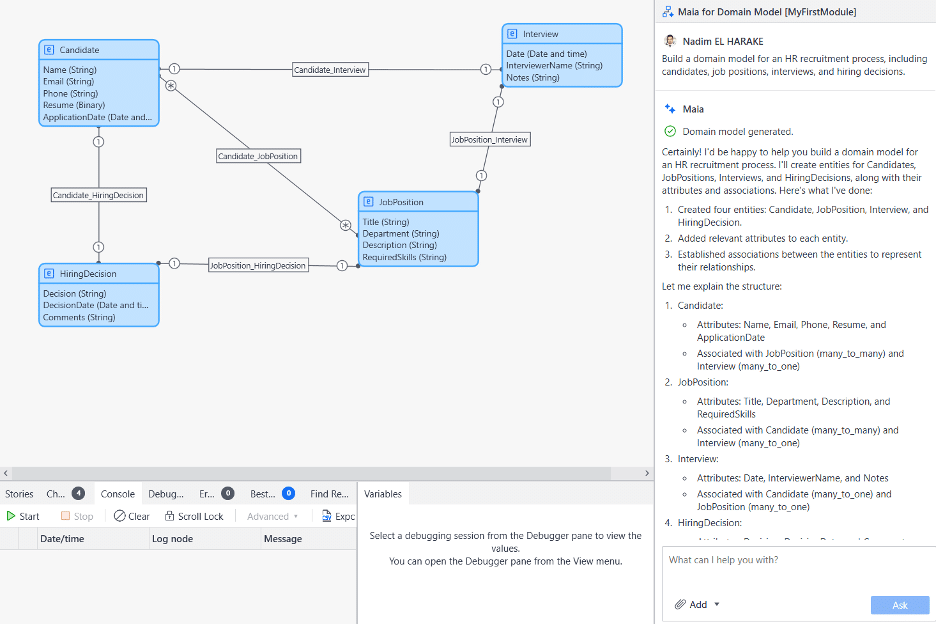MAIA permet de générer automatiquement un domain model à partir d’un prompt en langage naturel. Il analyse la demande formulée par l’utilisateur, identifie les entités pertinentes, leurs attributs, et structure le modèle dans l’environnement Mendix.