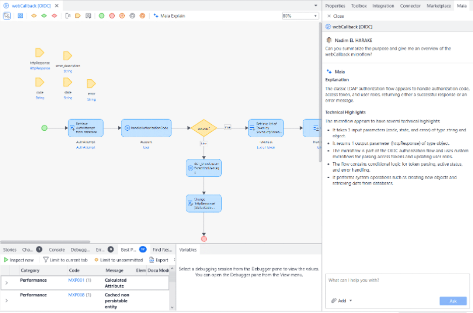 La version 11 de la plateforme introduit une nouveauté majeure : MAIA, pour Mendix AI Assistant. Ce nouvel assistant intelligent marque une évolution importante, en s’appuyant sur l’intelligence artificielle pour automatiser, suggérer et assister les développeurs à chaque étape du cycle de développement. L’ambition de MAIA est claire : faire entrer le développement Low Code dans une nouvelle ère, où performance rime avec assistance intelligente.